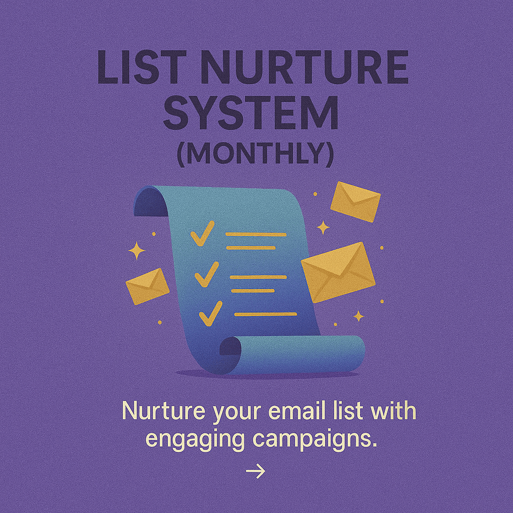 This retainer includes two expertly written and branded monthly campaigns sent to your list, list segmentation support, and analytics to track performance. Designed to build trust and drive consistent sales from your email audience.