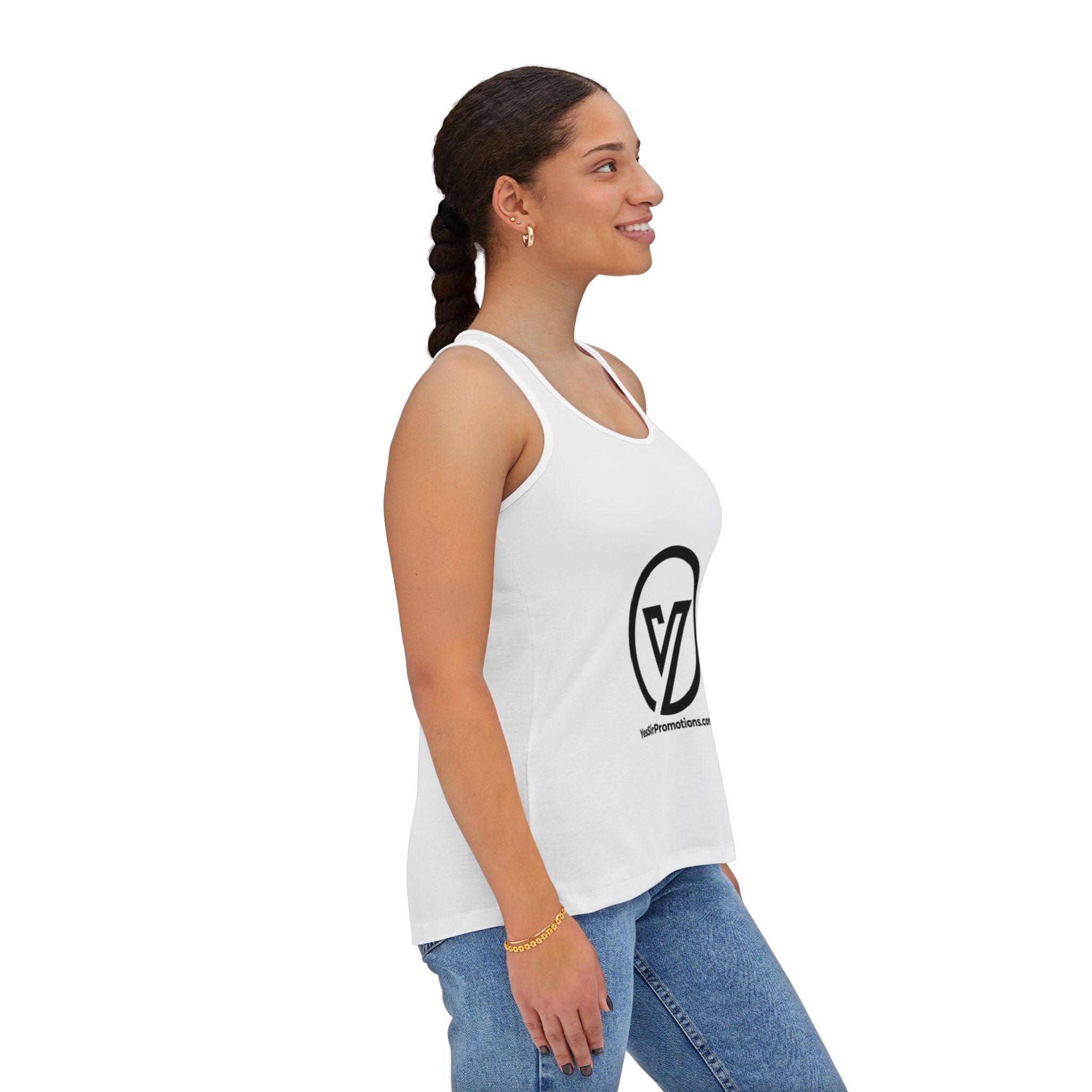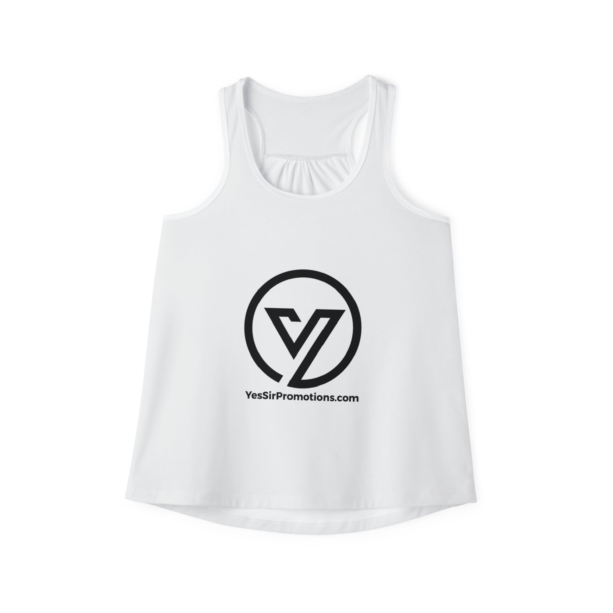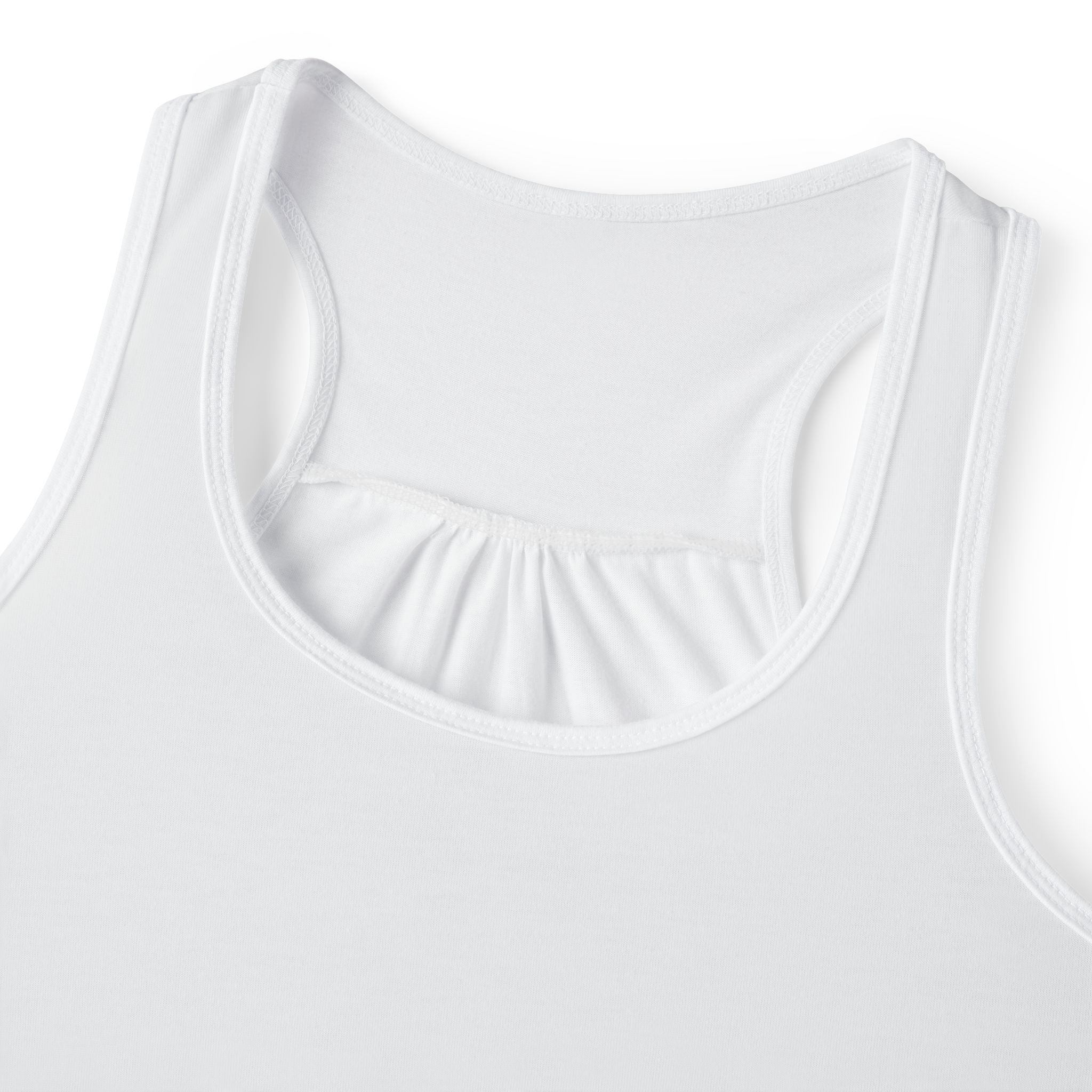 Breatheable and light, this tank top brings easy movement and a clean, modern silhouette to your everyday wardrobe. The high-cut scoop neck and cinched racerback create a flattering front and soft, gathered detail at the back that keeps the fit relaxed but feminine. The all-over printing holds vivid, crisp lines so logos and bold graphics read sharp against bright fabric. Wear it for studio sessions, sunny errands, or layered under a favorite jacket — it feels like you without the fuss.